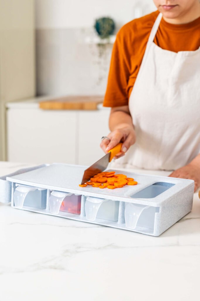 El Box es un innovador y práctico producto diseñado para facilitar la preparación y almacenamiento de alimentos en la cocina. Es una solución todo-en-uno que combina una tabla de picar con almacenamiento eficiente y limpieza rápida.
